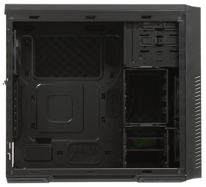 L’area interna è molto spaziosa e sufficiente a supportare 7+1 slot di espansione, che consentono di installare sistemi “enthusiast” che includono fino a 3 schede grafiche in configurazione SLI oppure Crossfire, un 3.5”/2.5” X-Dock Hot swappable e 7 bays per HDD.