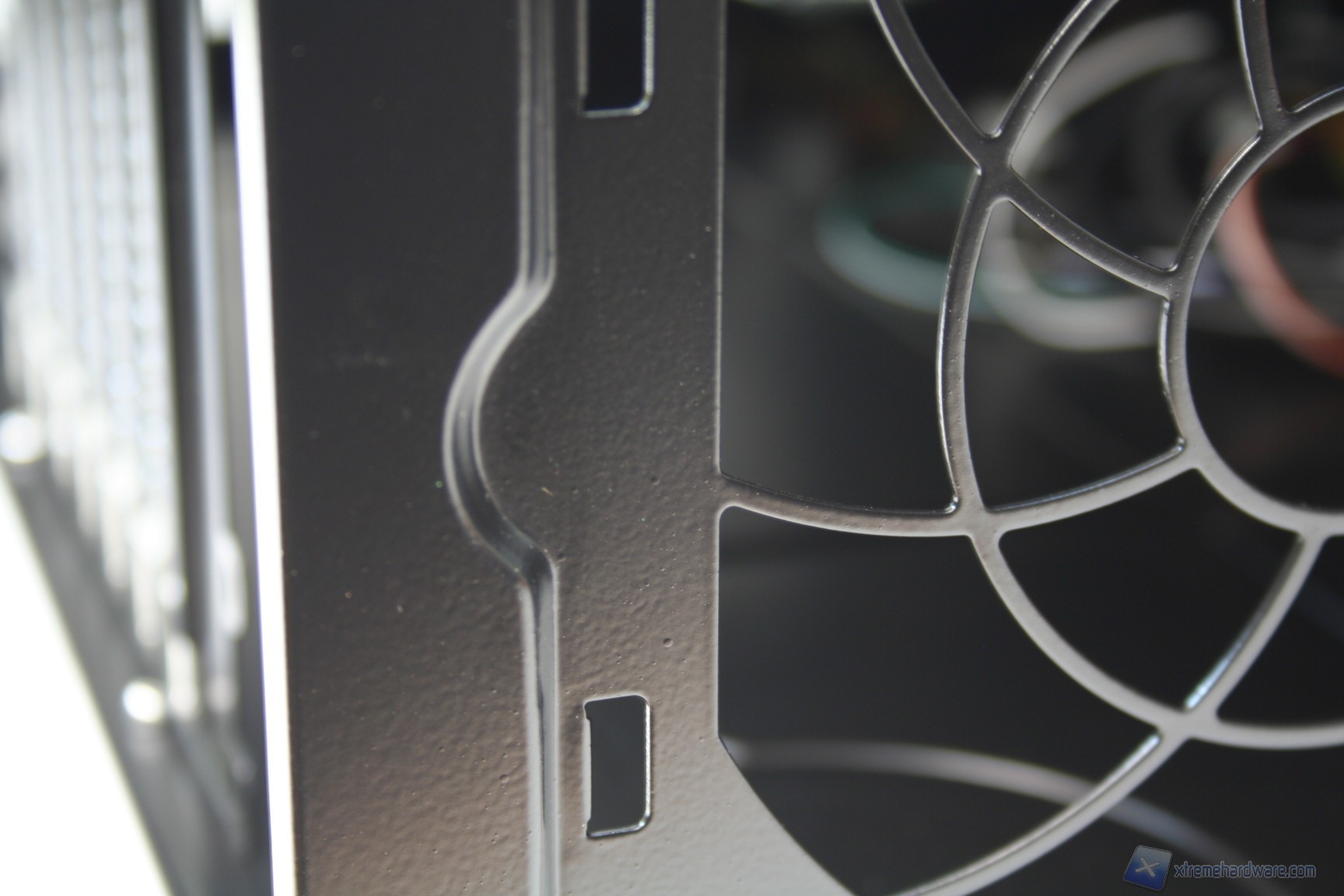 La parte superiore è caratterizzata semplicemente da una paratia, avente un’unica apertura con una griglia di aerazione, che permetterà il passaggio dell’aria dalla sottostante ventola da 120mm. Questa paratia superiore può essere facilmente rimossa tramite due viti nella parte posteriore.