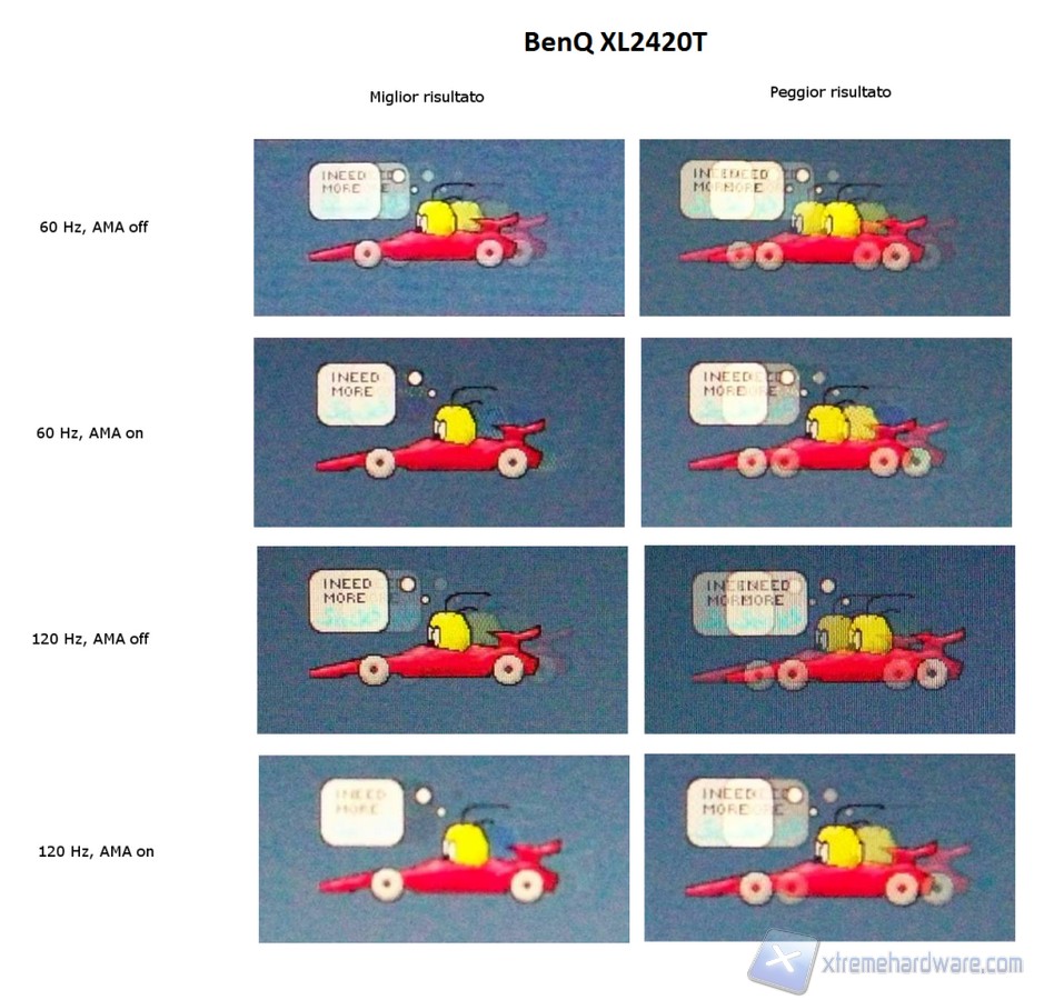 Per quanto riguarda il tempo di risposta, il BenQ XL2420T non mostra particolari problemi, dato che ha a disposizione un’arma in più: il refresh a 120 Hz. La funzione offerta dall’overdrive AMA (Advanced Motion Accelerator) e la modalità 120Hz, agiscono in modo differente, anche se entrambi contribuiscono a un unico risultato, ovvero migliorare la visione durante le sessioni di videogames. L’azione della funzione AMA, che può essere solamente attivata o disattivata, va a migliorare la reattività dei pixel, andando a limitare l’effetto ghost. Un’immagine più definita e con meno scie, risulta facilmente riscontrabile anche ad occhio nudo attivando l’overdrive AMA a 60Hz. In alcuni rari casi si manifesta il cosiddetto reverse ghost (immagine scura), ma l’esperienza di utilizzo rimane migliore con la funzione attiva.