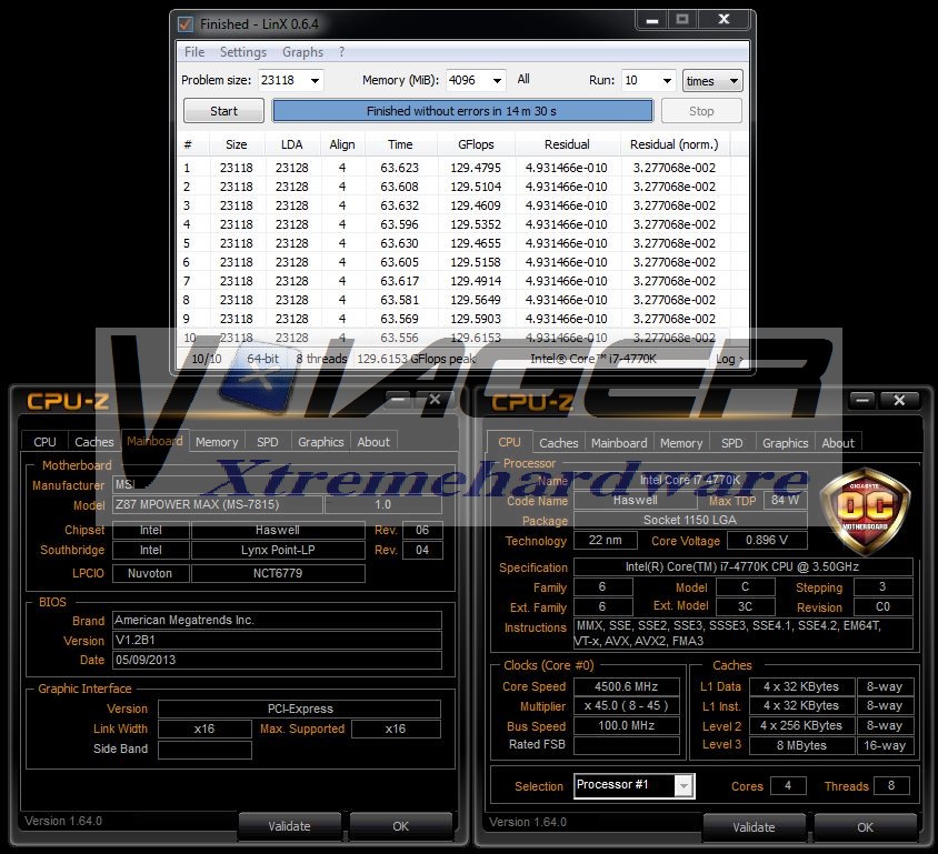 Con un dissipatore di fascia alta oppure con l’ausilio di un impianto a liquido siamo riusciti a chiudere LinX alla frequenza di 4500 Mhz. Soffermatevi sul valore computazionale di picco, ben 129,6153 GFlops.