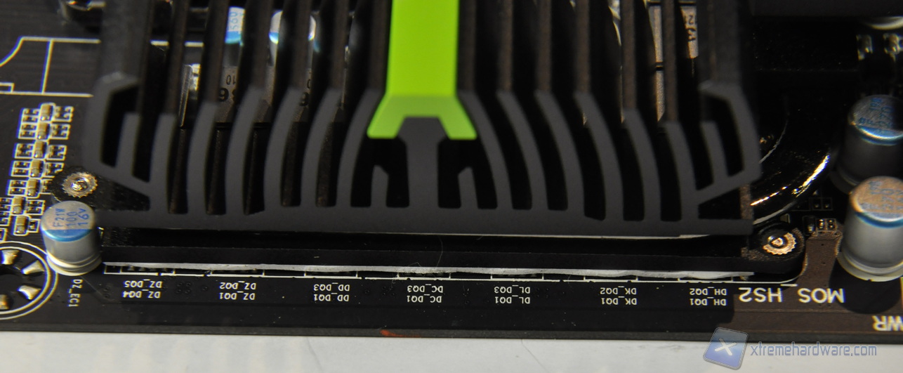 Non senza sorpresa, notiamo che i mosfet K0393, sono posizionatinella parte sottostante del PCB, per semplificare il layout della scheda. La bassa resistenza Drain-Source (Low Rds(ON) ) e il PCB da 2oz di rame assicurano basse temperature di esercizio senza la necessità di un altro dissipatore in questa zona. L’utilizzo dei Driver Mosfet, che integrano tutti questi componenti in un solo IC semplificherà notevolmente il layout delle nuove schede madri Ultra Durable 5. In questa zona notiamo inoltre dei controller IR3598 utilizzati per raddoppiare il numero di fasi che l’IR3567 è in grado di gestire (di base solo 6+2).
