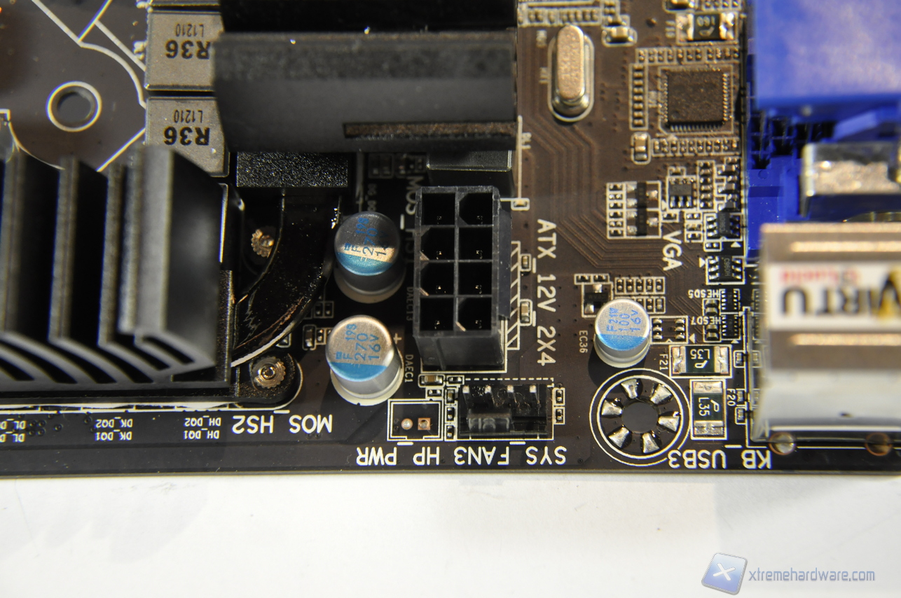 Particolare messo a nudo dello Switch PCI-Express PEX 8747 ad alte prestazioni e bassa latenza. La sua funzione è quella di sostenere ed amministrare l’intenso traffico tra le schede connesse agli slot PCI Express, mantenendo al contempo una latenza estremamente bassa. Ricordiamo infatti che le CPU Ivy Bridge sono dotate di due soli link PCI Express 3.0 x8, mentre la G1.Sniper 3 ne mette a disposizione ben quattro, grazie appunto allo Switch PEX 8747 che smista il traffico da e verso la CPU ai 4 slot presenti. Lo switch è purtroppo collegato direttamente alla CPU, ciò significa che anche quando non è necessario, ovvero anche in presenza di una sola scheda video, ci sarà una latenza introdotta dallo switch stesso e ciò come vedremo inciderà negativamente sulle performance grafiche con singola scheda. D’altra parte, non è questo il target di utilizzo di una scheda madre da circa 300€! In configurazione multi-GPU, la G1.Sniper 3 darà il meglio di sé, grazie anche al nuovo standard PCI Express 3.0 che permetterà di avere a disposizione una elevata bandwidth anche in configurazioni a 4 schede video, a condizione ovviamente di utilizzare CPU (Ivy Bridge) e schede video (28nm) che supportano tale standard.
